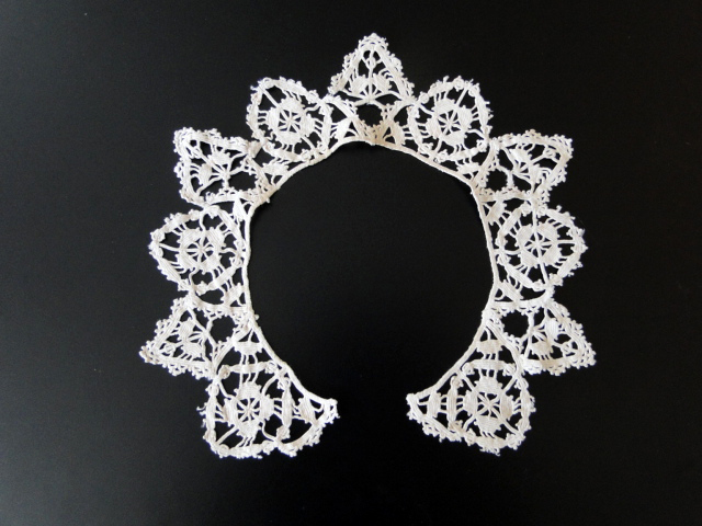 Comments: The bobbinlace is more a Duchesse de Bruges without very much raised work. I like the needlelace insert, the rose has a kind of angular style that is different and interesting. Condition looks very good – I don’t see any obvious problems.