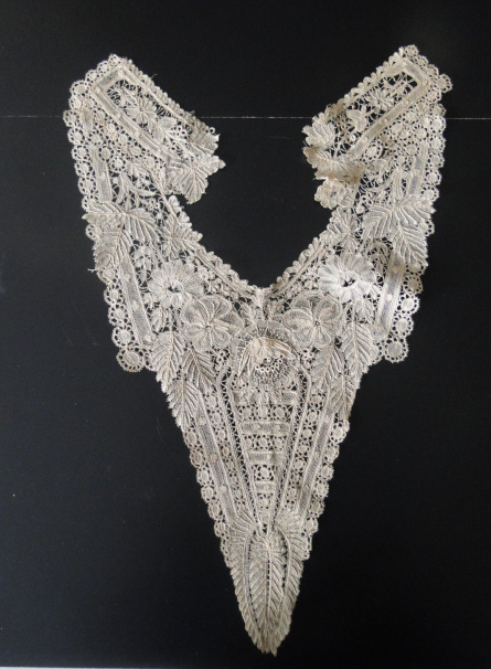 Comments: A good Point de Gaze dress front with neckpiece – these two elements look like they are part of the same piece, not joined together. Good design, the space is well used. The motifs are a bit conventional, but it is well executed and has some nice fillings. Condition looks very good, might be a pinhole or two in the net, but very minor.