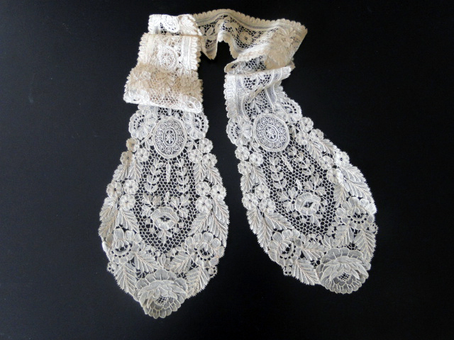Comments: Nicely worked Duchesse de Bruxelles joined lappets. The picoted bar ground at the ends is quite unusual. Multiple layers on the end needlelace roses, and a good medallion of fillings just where the design starts to swell into the termination. Excellent work. I don’t see any condition problems in the photos.
