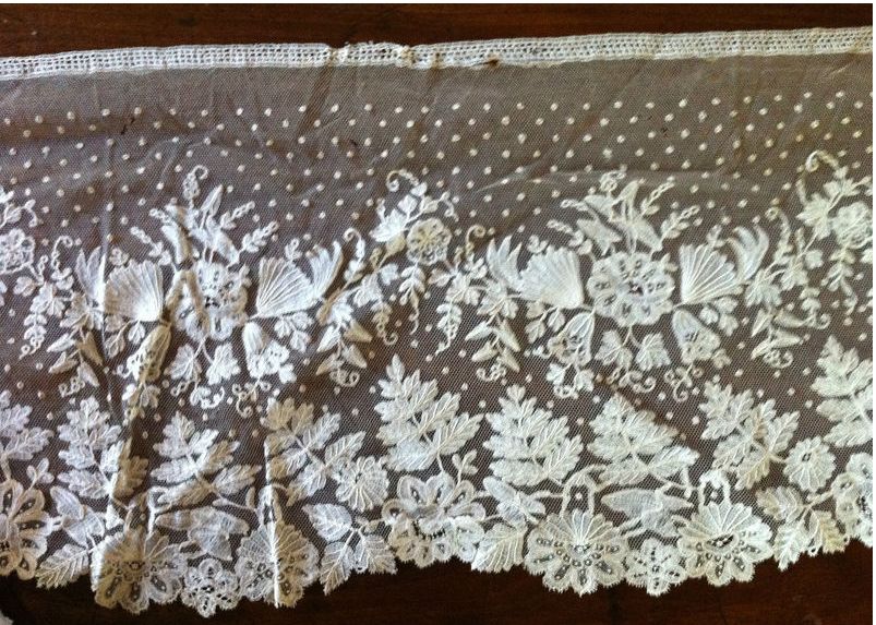 Comments: Another Brussels Application piece from the same seller. This one has a lot going for it in the design, and note the dots in the upper ground. The bobbinlace is more detailed and denser. Again, only minor needlelace accents. Some small holes throughout basically in the net, also some staining. There’s a long repair to the net, although I’m not sure where it falls in the overall length.