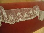 Comments: A Duchesse de Bruxelles scarrf. Note the large elaborate point de gaze rose with raised petals on the end – that seems to be the only needlelace in the piece. The design is good – cartouches filled with different flowers working their way up the scarf. The motifs do seem a little large for the design. Overall very good condition, I can’t spot anything wrong.