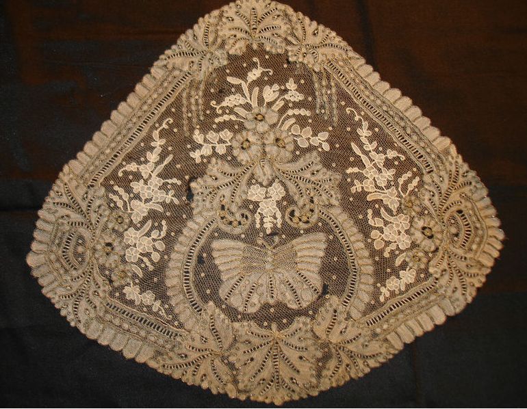 Comments: 19th c Point d’Angleterre bobbinlace with a point de gaze reseau. The raised centers of the bobbinlace flowers resemble Rosaline, and I see that a little bud of Point de Gaze snuck into the design. I like the bobbinlace better than the needlelace in this piece. It’s a little more conventional than the often over-the-top Pt d’A pieces that are some of the best of the 19th c Belgian laces. Looks in very good condition, I can’t spot anything wrong from the photos.