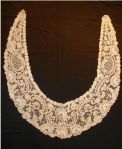 Comments: A collar of Carrickmacross applique on machine net. That allows for net embroidery stitches used as fillings, as well as some cut out areas filled with picoted brides. Some of the cloth applique also includes a little embroidery. Typical Carrickmacross large ring edging. The piece is somewhat the worse for wear, the edges are not very crisp, and there’s some stain spots. A little fraying in some of the motifs mainly along the lower edge.