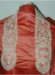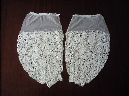Comments: An interesting pair of sleeves showing how very good Irish Crochet can be used as yardage. The motifs in the lace are tightly worked, varied in design, with raised ring centers. Looks like Clones knots on the bride ground. A very effective presentation, only minor damage from a broken bride or two.