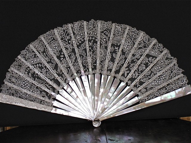Comments: A very light and airy Belgian needlelace fan with mother-of-pearl/bone sticks. No raised work, which is not a detriment. Very good filling work – a real exercise in rings. I can’t spot any condition issues.
