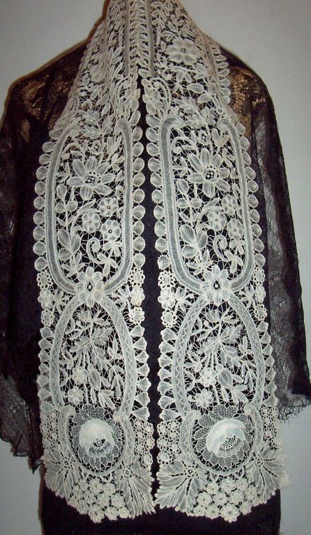 Comments: A very good Point de Gaze shawl collar with lappet ends. Good raised petal roses, and well-done jour fillings. Very good medallion of fillings at the termination of each lappet. An impressive piece with well-scaled design. Condition looks very good, maybe a pinhole here and there, but this is very minor.