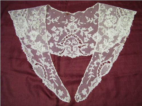 Comments: A very good Duchesse de Bruxelles collar. Nice scalloped bobbinlace design with raised work, and 3 inserts of Point de Gaze roses. Some damage to the needlelace ground in places, but else very good.