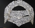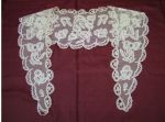 Comments: Collar and cuff sets that survive together don’t come along too often. These are Duchesse de Bruxelles, with unusually shaped raised leaf roses. The needlelace fillings in the roses are several concentric half circles of rings – unusual. There is a slight asymmetry to the design that is quite nice. They do seem a little wrinkled, and I see a few separations between motifs, but overall good condition.