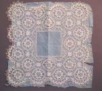 Comments: Bruges Bloemwerk handkerchief with a name embroidered in the cloth. Conventional motifs, picoted bride ground. Looks in good condition from what I see, but there aren’t many closeups.