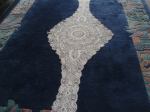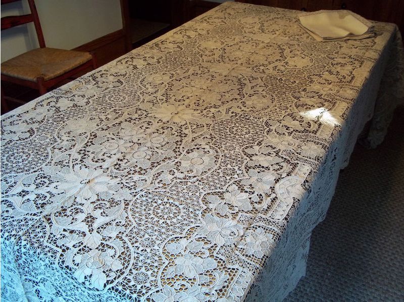 Comments: A banquet-sized tablecloth and napkins of probably Italian needlelace and free reticella, with provenance. It’s a fairly heavy design that does not appear to have been much used. A little light staining. The ground decoration is quite interesting, but the flower and leaf motifs are a bit conventional. The very best of these pieces have extensive figural work – this one is a bit plain.