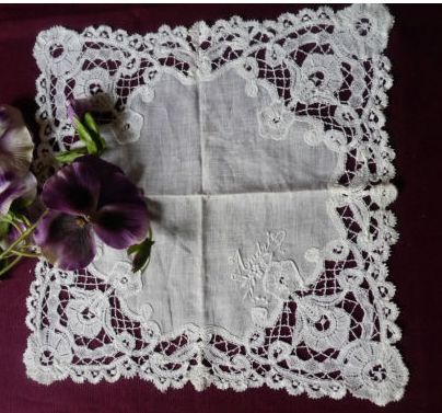 Comments: A Bruges Bloemwerk handkerchief, fairly narrow lace border. The design is conventional, no needlelace fillings. Picoted brides. Condition appears very good, I can’t see any problems in the photos given.