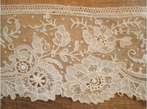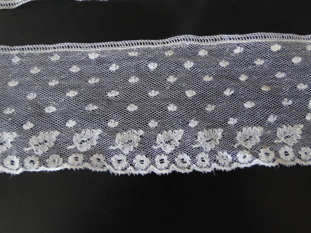Comments: A narrow border of Belgian Point de Gaze. The design is conventional, no raised work, and includes a little filling work. But it is very long, and apparently in quite good condition, just some stains. Basically I’m curious to see how this does in the market.