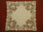 Comments: A Bruges Bloemwerk handkerchief – the design is actually quite nice. It goes a bit beyond the standard rose/leaf pattern to include some interesting scalloped brackets in the corners. I don’t see any obvious problems in condition, maybe just a small brown spot here and there.