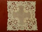Comments: A square table cover with a deep Maltese border. Can’t tell if the lace is silk. The pattern is quite simple, alternating 6 petal flowers with triangular woven leaf fillings along the borders. I see three such insertions joined together for the inner pattern, and an outer border of rosettes, and an inner on of woven leaf crosses. No Maltese crosses in this design. the pattern is quite effective, the condition is very good – looks unused.
