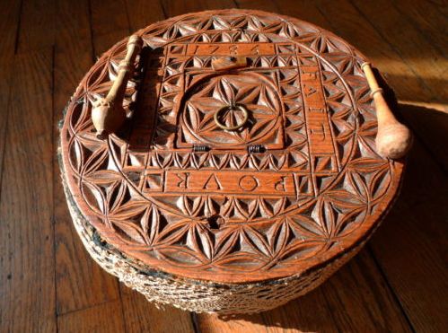 Comments: A Queyras pillow, quite narrow, with an inscription that says something like “1785 FAIT POUR” and can’t read the 4th side. This pillow is made for freehand lace, and there are reproductions being made today. So you do take a chance, even with the description. The bobbins do look good, and note the little door in the center of the side. There might be some lace around the circumference – wish there were more photos. Authentic examples of these pillows, which were usually used with a stand, are quite rare. A similar inscribed pillow with an unrelated Maurienne stand and good provenance was sold by Roger Sala on the Leboncoin.fr site, presumably for the asking price of 2,500 EUR about two months ago. Unfortunately the listing was removed after the sale.