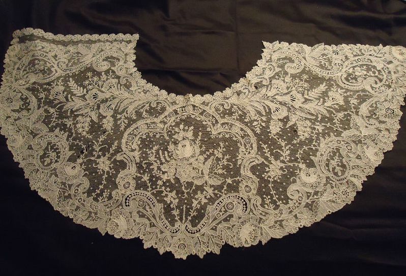 Comments: A Duchesse de Bruxelles bertha. The point de gaze inserts have no raised work, and appear in good condition. The bobbinlace is well done with some nice bell-shaped flowers. Overall condition is quite good, seller cites some stains and a few loose threads, but I’m having trouble spotting any breaks.