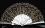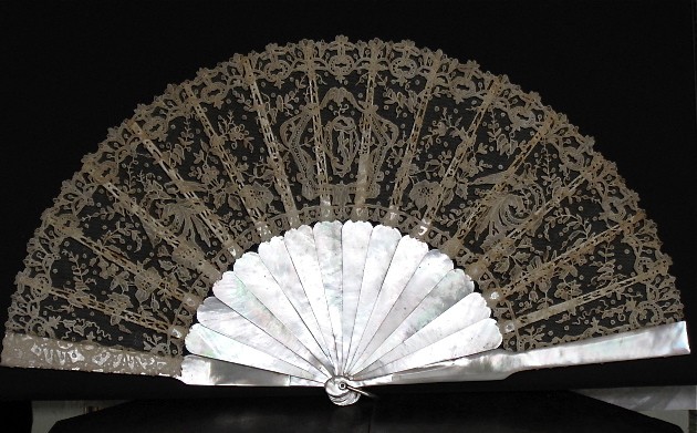Comments: A Brussels needlelace application on machine net fan leaf. Note the monogram in the Center. The design is quite detailed and tending toward the naturalistic. No elaborate fillings, just a few little rings for accent. Seller cites some damage to a few sticks, but the lace seems to be OK. Just some storage discoloration. It’s a nice looking piece.