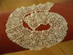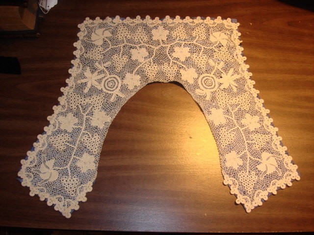 Comments: A Duchesse de Bruxelles bertha. Rather open work in the linen stitch in the bobbinlace. The flat rose inserts of point de gaze are fairly simple, no raised petals. I find the motifs a little large for the form, but quite well made. Condition is very good, no damage I can see. Seller cites a few broken brides, but this is very minor wherever they are.