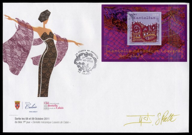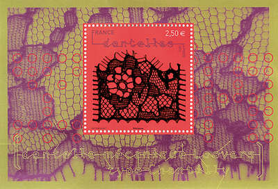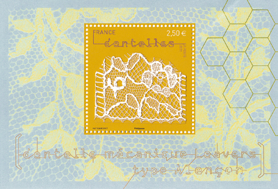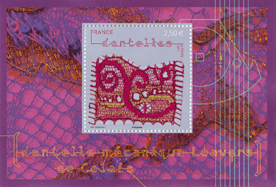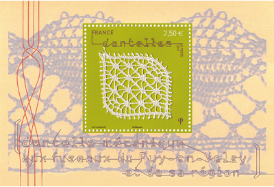Four interesting stamps have just been released in France honoring machine-made lace. If I understand correctly, a hot glue is applied to a large piece of lace to stiffen it. The lace is then cut into sections by hand, and fixed to the stamp. They represent Leavers Chantilly, Puy-en-Velay and surrounding regions bobbinlace, Leavers Alençon, and Leavers Calais. A stamp issued in this format is called a ‘souvenir sheet’, and these measure 10.5 cm by 7.15 cm. They are already showing up on Ebay and Delcampe, usually priced from 4.00 to 4.50 euros per stamp. But the best way to buy them is to go directly to the French mail service La Poste site, http://tinyurl.com/3no46z9, where they can be ordered for 2.50 euros each. The symbol Φ is included in the design of three of the stamps – you are supposed to find it. It is in the lace itself, and is not the Le Puy one.
