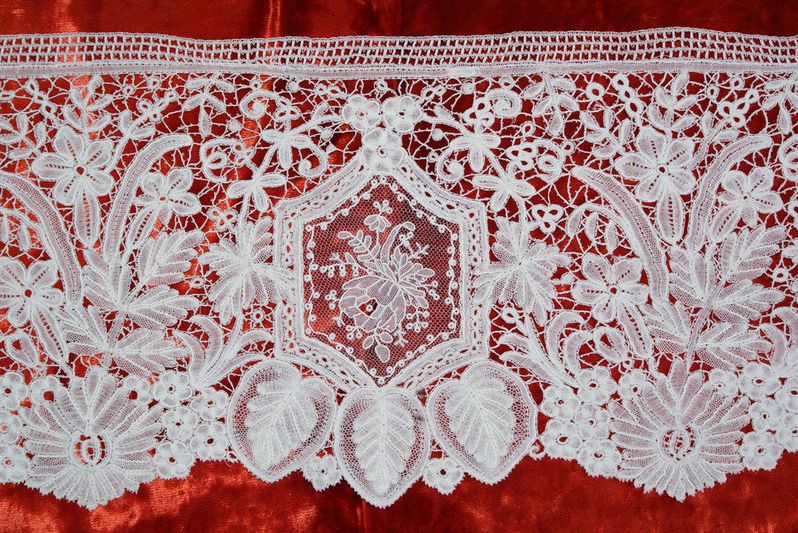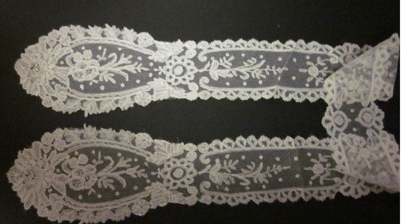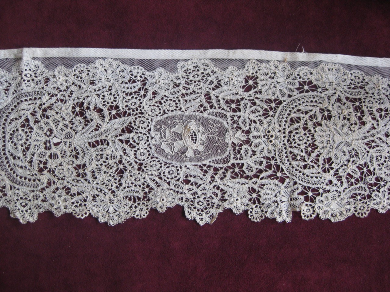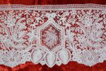 Comments: This doesn’t say Honiton to me, it looks like a Brussels bobbinlace applique on machine net. There are a few needlelace fillings, but not much. It’s not a very sophisticated piece in design or execution, made more for the middle market. The net is is in pretty good shape which counts a lot in a piece like this – just a few tiny holes. The motifs are not very crisp – could be a sign of washing.