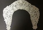 Comments: It is very pretty. Snails/slugs Honiton collar in very good condition. There is a border of large flowers around the outside edge, and a looped motif on the neckline. Other motifs are fit in the middle. When I say ‘snails/slugs’, this is indicative of a general style, in fact ‘slug maker’ was a well accepted Honiton specialty. Quality can vary a lot in laces like this, and the design is more aimed at the middle class buyer. This is a very typical example.