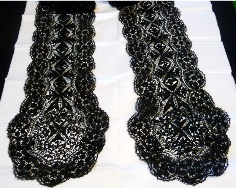 Comments: I’ll assume these lappets are joined in the 19th-20th century fashion. Black Maltese isn’t all that common, in fact if it weren’t for the St. John’s cross I might think this came from somewhere else. The leaves aren’t quite as well done as you usually see, but there’s some nice guipure work. Condition looks a bit wrinkled, but overall quite good. One photo shows some small brown stains.