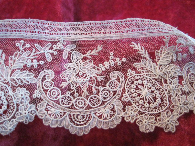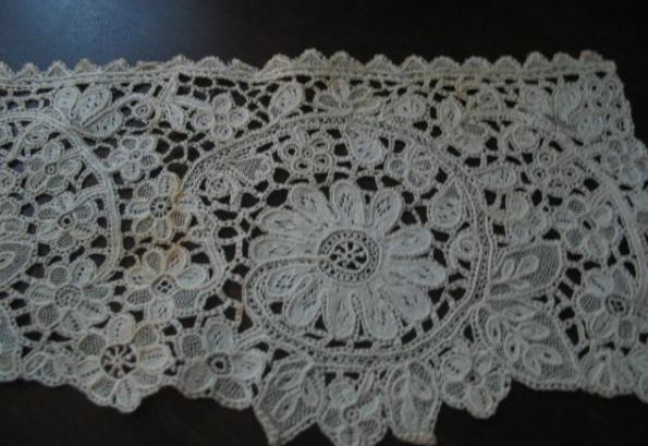 Comments: Brussels bobbinlace with the droschel ground worked around the motifs. It could be Devon, very hard to say. I’d personally go with Belgium because of the extensive snowflake fillings in some motifs. I like the butterflies. For a piece like this it is in fairly good shape – you often see a lot more damage to the droschel ground.
