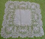 Comments: Another Brussels bobbinlace applique on machine net, similar to the previous piece but less elaborate. Something I haven’t seen before – the handkerchief linen has a buttonhole cut into it to attach to a dress. There appears to be some yellowing, and some of the arcs along the center cloth look like they are missing a few brides.