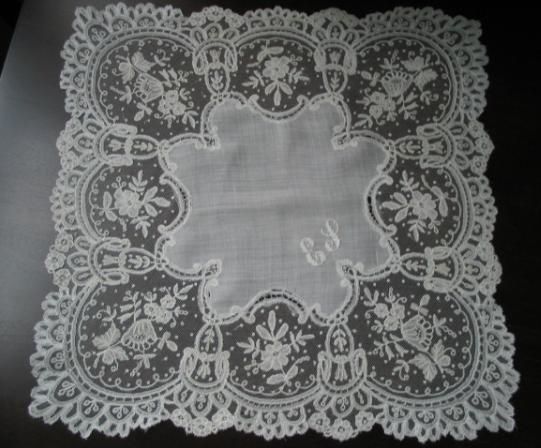 Comments: Brussels applique on machine net handkerchief – no needlelace other than some tiny fillings in the flower centers. A few pinpricks in the net, see description especially along the join to the cloth, all pretty minor. The piece has a nice presence, with a rather conventional basic design well organized into separate 8 separate vignettes. Monogram initials are well done.