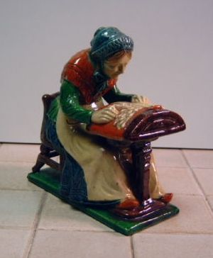 Comments: A Flemish pottery lacemaker of large size. I think it might be from the Pieter Jozef Laignel (operated 1898-1929) pottery. The colors on this one are quite brilliant. Hard to say about condition, the seller doesn’t say anything, and there isn’t anything obvious from the single photo.