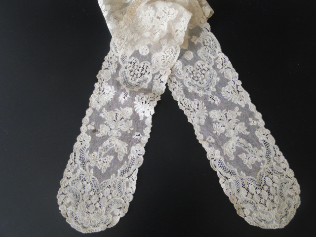 Comments: A beautiful set of Brussels bobbinlace with droschel ground. The work is very fine, with good, varied fillings. Mid 18th century. I love the way they change to the denser pattern at the ends, almost recalling the slightly earlier bride bobbinlaces. One obvious spot on the left side of one lappet, otherwise the condition looks very good. Especially the droschel ground, which rarely survives so well. The two lappets are mirror images, and are joined at the top, which is how so many of these pairs have survived together to the present day. The actual join is not shown in the photos, and from the measurements, they might be a little short (I assume 22.5″ each) Which could indicate some cutting short at the tops. But it’s really hard to tell, without a photo. Unless there’s a lot of cutting, I would consider that minor.