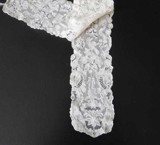 Comments: A single lappet of Brussels bobbinlace with droschel ground, much like the set described above. This one has a denser design, and the phoenix and fountain designs are wonderful. Sometimes birds in pieces like this are done in needlelace, but not here. Good filling and bride work. Condition is very good, just a few minor spots. I do have an issue with the top end, it looks modified -I think some unrelated pieces have been sewn on. The termination should be a straight line. With a piece of this quality that’s unfortunate, but not major. Just wish I knew what happened to the matching lappet!