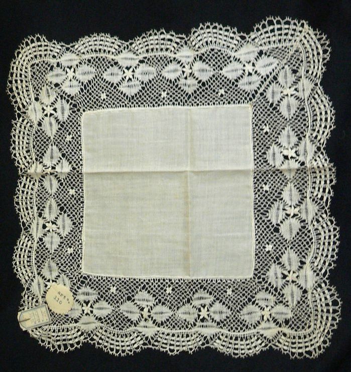 Comments: Take a close look at this piece, it’s more interesting than it might first appear. The ‘torchon’ style is combined with some plaited work around the edge. It has a Madrid label, although exactly what that means is hard to tell. Condition looks very good, but there’s only one closeup. I wonder how it came to be in Texas. There’s a story behind Spanish lace imported into the Americas that someone needs to investigate.