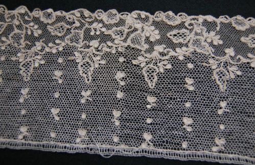 Comments: A ‘Herren Alençon’ type border, meant to be ruffled. The edge has a plain reseau ground, the dotted larger border is the ‘twisted bride’ work. Basically a hexagonal base is set up across the width of the piece and a second thread twists around the legs of each mesh. This type of lace was made from the late 18th well into the 19th centuries, in both Alençon and Argentan. This one has some pulls and repairs in the ground, but looks in pretty good shape. Note some photos are taken from the wrong side.