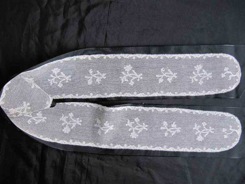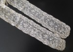 Comments: A pair of Alencon lappets, joined together at the top ends. They have the sparser look of later 18th century work, detailed around the edges with scattered small motifs in the center. Ordinary reseau ground, and nice fillings worked in the spaces along the edges. Interesting picot work, or rather the lack of picot work. Picots are only used along the outer edge and around a few of the edge motifs. The photos aren’t close enough, but I’m having a hard time seeing if the horsehair used to make the picots is still there. Overall it’s a good example of this type of lappet. The net ground has some pulls, but it is rare for this ground to survive intact. The area of the top join is also not shown, so it’s difficult to say whether they have been shortened. The overall length probably indicates that things are intact.