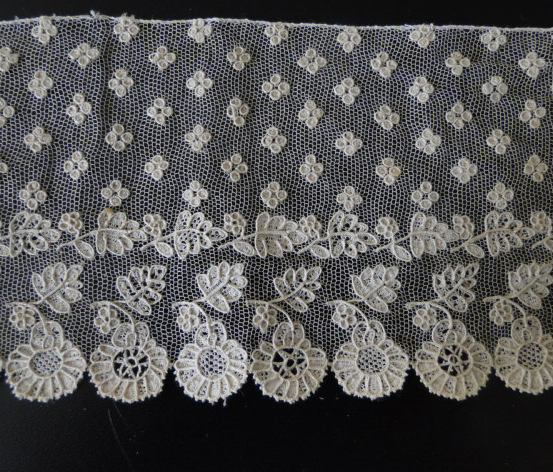 Comments: A pair of joined ’round hole’ Valenciennes lappets. This is one of my favorite laces. The design depends only on the excellence of the clothwork, with rows of holes giving a ‘line drawing” appearance. This has the sparse design of the later 18th century. I’d go around 1780 on the basis of the design. The condition of the lace appears very good, no obvious holes or damage. But there are some condition issues. The lappets have been shortened, and you can see the discontinuity of the design at the top join. I’m also fairly sure that the picot edge is a later addition, this was often done to ‘sharpen up’ early laces. It would be a machine made row of picots sewn onto the edge.