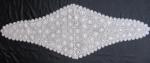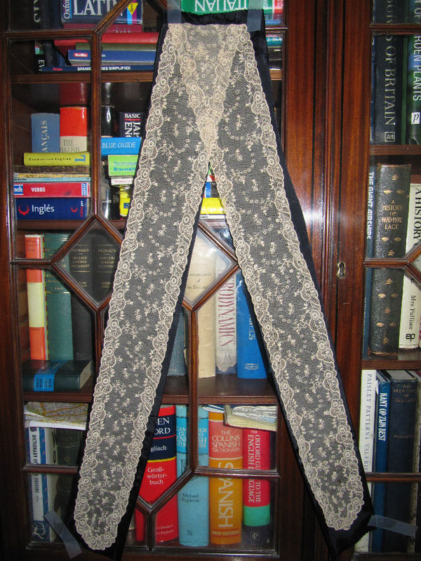 Comments: A good narrow lappet-ended scarf of Point de Gaze. No raised work, and few fillings, but I like the contrast of the denser edge motifs and the lighter flowers on the needlelace ground up the center. It has a funny edge treatment with a thread running between widely spaced picots. And note the double looped edge to the filling rings which is probably a characteristic of this manufacturer. It actually is a fairly simple piece, but looks quite nice. Very good condition.