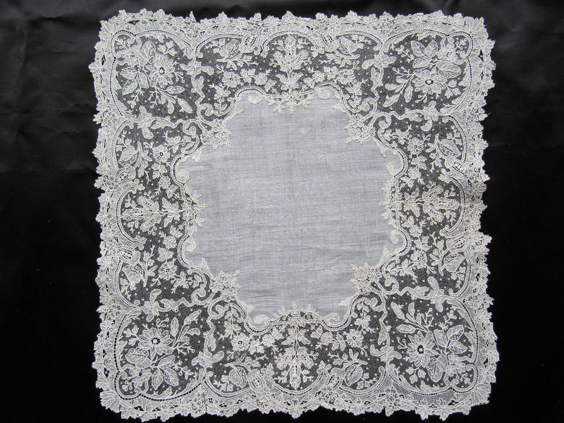 Comments: A Brussels Duchesse handkerchief, no needlelace which puts it more on the Bruges side. Good work on the flowers. I don’t see any major damage, but the whole thing has a bit of a wrinkled look. Maybe recently washed?