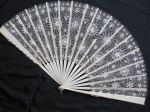Comments: I’ve never seen a Nanduti fan before, this is a very good piece. The work is quite fine, concentrating on medallions with little of the grid-like large area fillings that are so characteristic of this lace. The lace is so fine that I find the carved sticks a bit of a distraction – the lace might be better served if it were removed from the sticks. One broken stick, but I don’t see any problems with the lace. Comes with a box, presumed original.