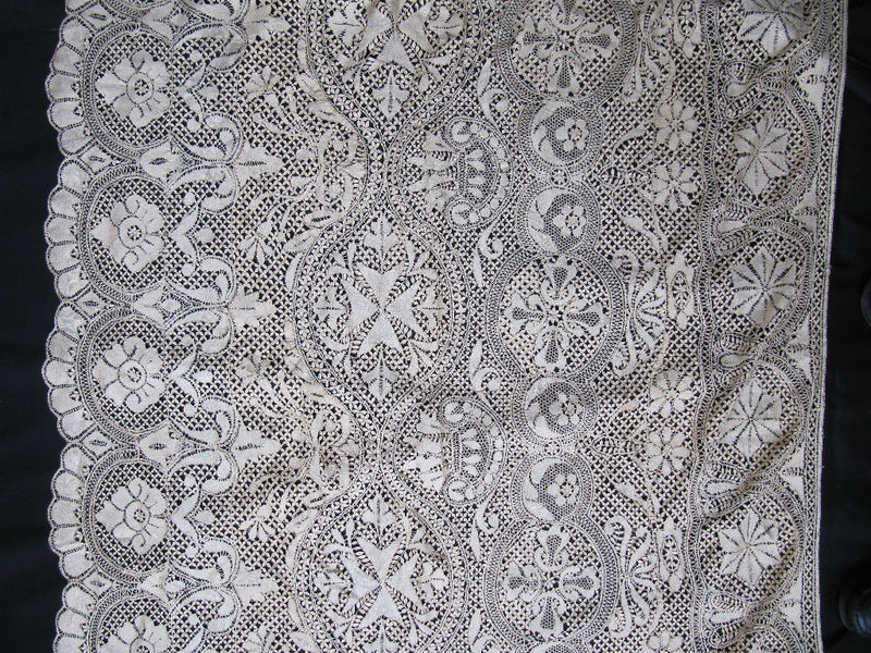 Comments: A very long, very wide Maltese border. A lace like this is made in strips to accommodate the long, narrow Maltese pillow. These are sewn together for after careful matching for the final piece. This one has an excellent design, with well-worked guipure motifs against a plaited leaf background grid. Whether a lace like this was made in Malta or Gozo is open to question, but the better quality guipure work could be a sign of Gozo work. It’s also a little hard to think of a use for such a piece outside the church. I don’t see any condition problems from the photos. Very nice piece.