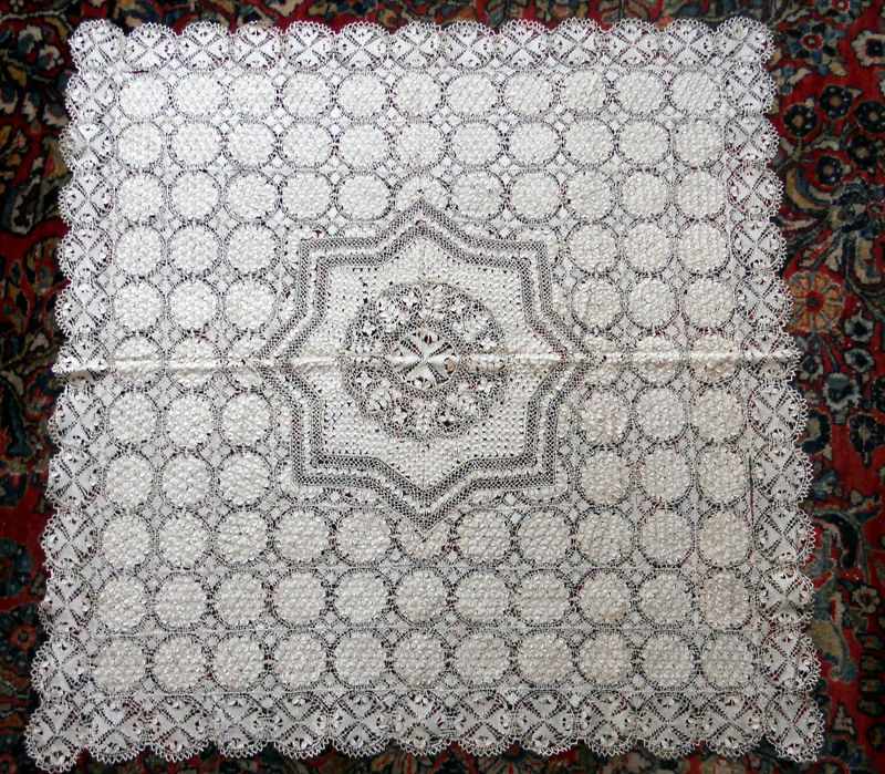 Comments: A fine Teneriffe or Nanduti head covering. Even though it lacks the palm leaf edge, I’m inclined toward Nanduti on this because of the very fine work and extensive use if filling stitches between the sol motifs. Note the half-roundels on the edge, which is very unusual. I am a bit bothered by the series of crosses down the center of the piece, and the mismatch in the edges just at that point. It almost looks like this has been joined from two separate pieces. Maybe not, but it does look just a little odd. The condition appears very good, I can’t see any problems.
