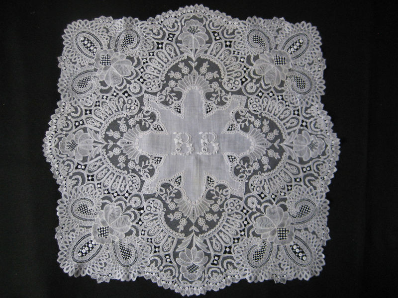 Comments: This is really fun.It’s a Brussels application on machine net but with a fairly wild design. Nice needlelace fillings, mainly different varieties of rings. The work on the bobbinlace is great, note the large areas of cloth stitch. It looks like the wavy pattern you see in the lower leaves of the corner motifs is deliberate. The whole thing is also quite large for a handkerchief. Very minor defects. My only complaint is that the BB monogram, although nice, just isn’t up to the standard of the rest of the piece. Even a single letter monogram could have made better use of that complex space.
