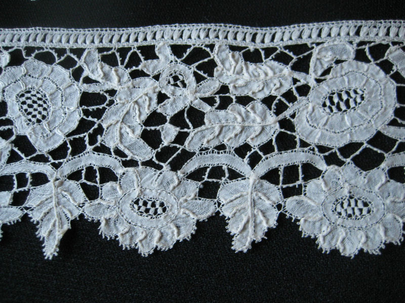 Comments: A Honiton guipure border with a narrow repeat. The work is closely done with good raised veining and fillings. It’s a nice, gold design, well beyond the snails/slugs venue. I don’t see any damage from the photos.