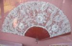 Comments: If you buy this piece, please lose that awful frame. But I suppose it helped preserve the lace, which is quite nice. Point de Gaze with blonde ‘faux’ tortoishell sticks. The raised petal roses (note windows in the petals) are fairly large for the design, and there are good ornamental fillings. The condition looks surprisingly good.