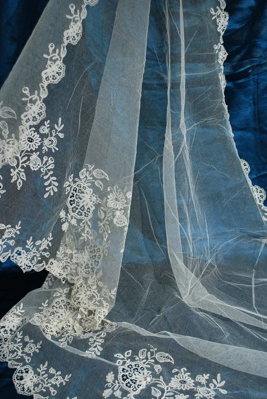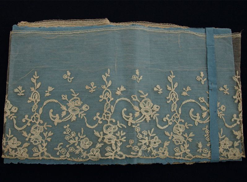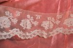 Comments: Brussels applique on machine net. The wonderful drape of the net shows up beautifully with the blue background in the photo. The bobbinlace is excellent, and the large negative spaces in the flowerheads is unusual. All-in-all a beautiful piece in very good condition. I only wish it were photographed flat so you could see the entire design.