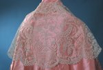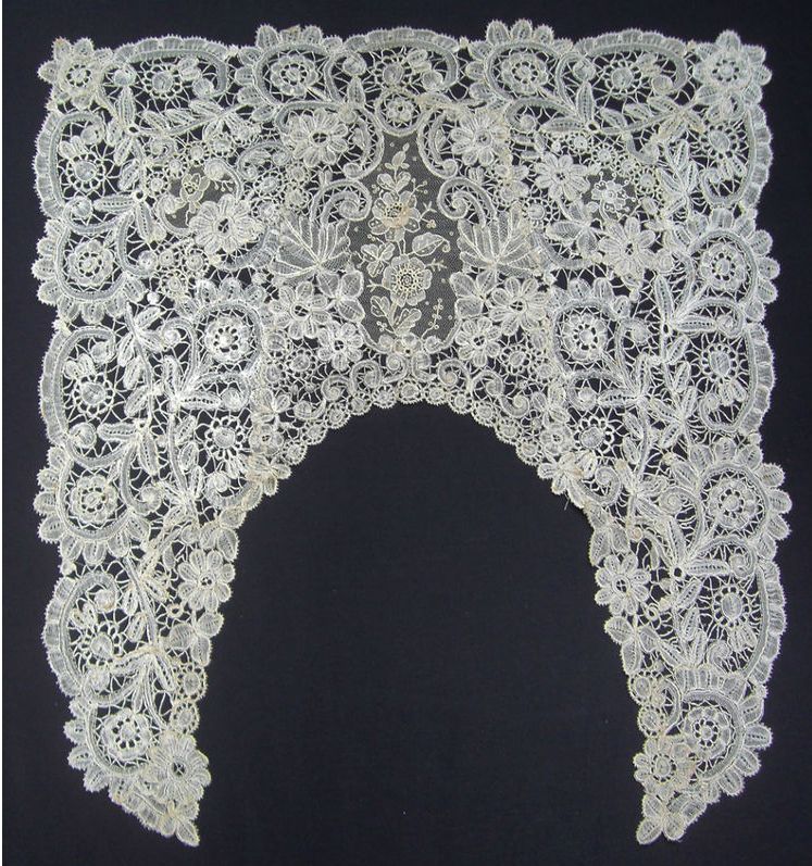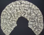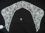 Comments: Brussels application on machine net. The collar seems to be attached separately. Good quality bobbinlace with some small needlelace fillings with a nicely thought out design. Condition looks very good, seller cites very small seam separations around the collar. The shape is a bit odd, I wonder if it wasn’t a semicircular hat veil at some point.