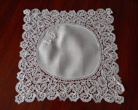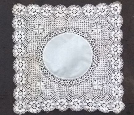 Comments: A flat design Point de Gaze handkerchief with monogram. Very good condition, I can’t see any problems. Good design working well with standard motifs. Some nice needlelace fillings, and it looks quite effective for the setting.