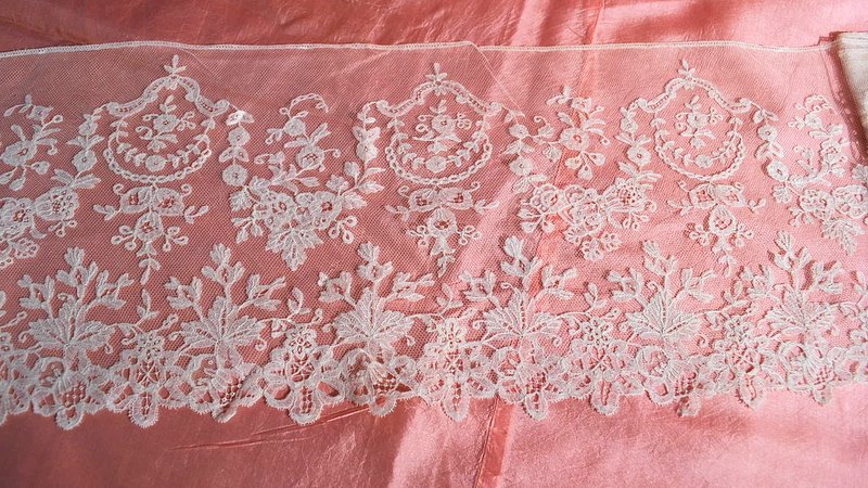 Comments: Another Brussels application on machine net, this one wider and more elaborate than the previous piece. This one is wide enough tha tyou might call it a ‘crinoline’ flounce, meant to be displayed for its design on large hoop skirts of the second half of the 19th century. The design has a naturalism enhanced by the openwork in the flowers. Not much needlelace, just a few ornaments along the bottom. I’m not sure if those chains in the bottom narRow scallops are needlelace, not enough closeups to tell. Seller cites a few small holes and breaks