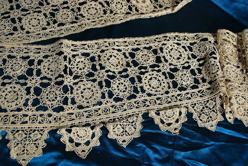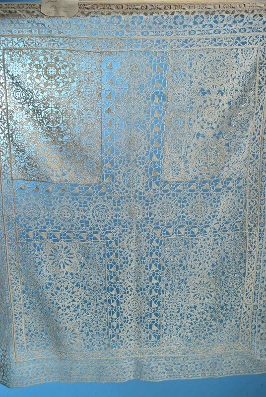 Comments: There are those triangular motifs again in the reticella. I’ll guess 19th c Greek or Cyprus on this one, but it does have a lighter appearance than most Greek lace. It also looks assembled from other pieces, some of the motifs look cut off at borders. An impressive looking piece in very good condition.