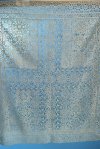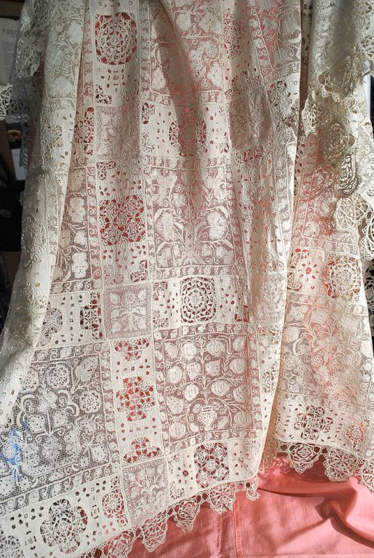 Comments: Yet another Brussels applique on machine net. A more elaborate design, quite crowded with flowers and swags. Needlelace rings as ornamentation. Seller cites a few small holes, nothing serious. Overall very good condition. I wish a manufacturer’s name had survived with all these pieces – they seem to have been bought all together originally. Maybe part of an bride’s trousseau?